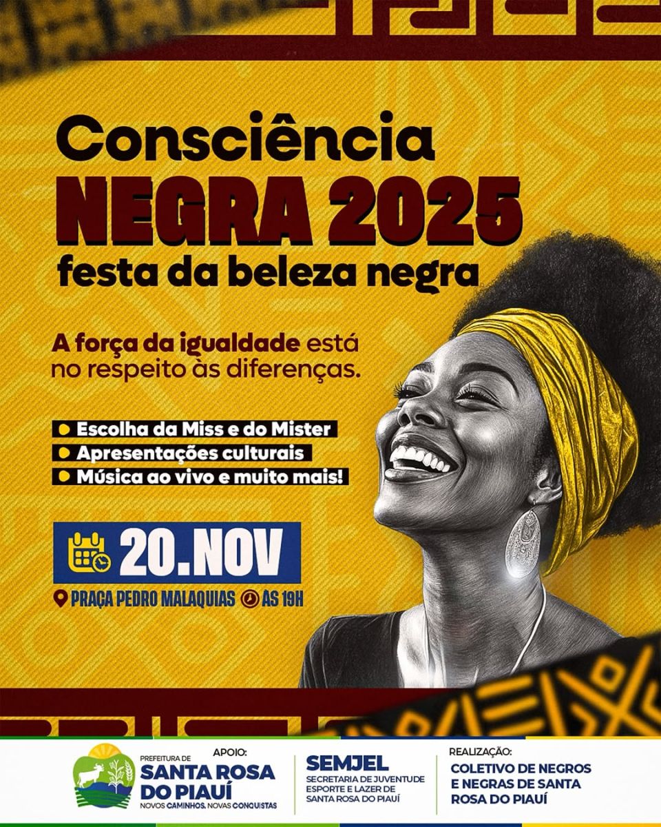 O município promoverá, no dia 20 de novembro, uma noite dedicada à celebração da cultura, da história e da valorização do povo negro. A programação contará com apresentações culturais, escolha da Miss e do Mister Consciência Negra, além de música ao vivo e outras atividades abertas ao público.