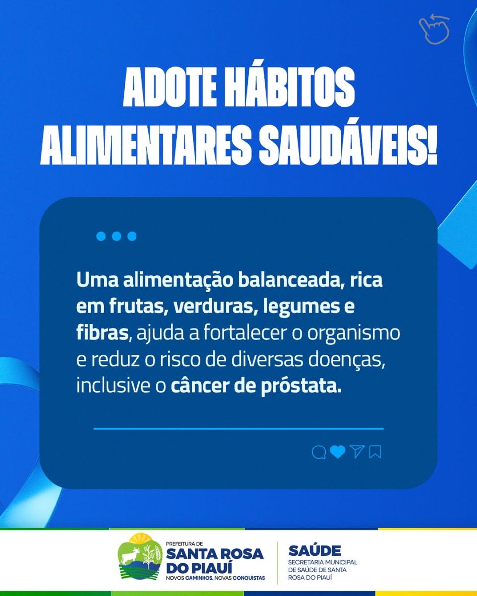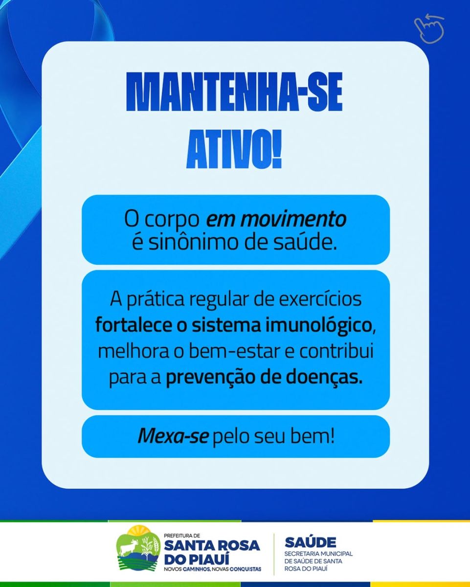 O município está promovendo a campanha Novembro Azul, voltada à conscientização sobre a importância da prevenção e do diagnóstico precoce do câncer de próstata. A iniciativa incentiva a adoção de hábitos saudáveis, a prática regular de atividades físicas e a manutenção dos exames em dia.