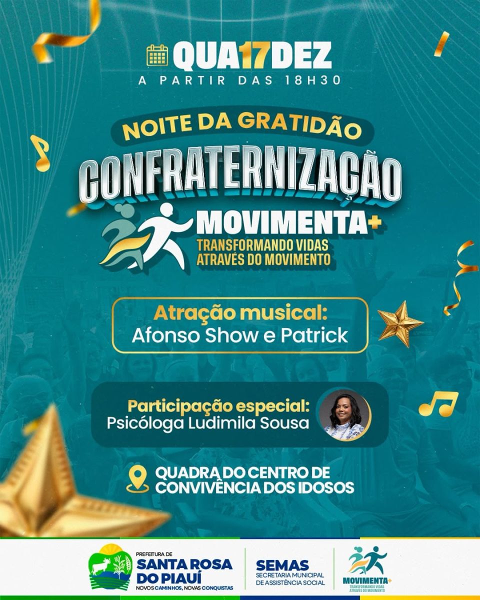 O projeto Movimenta+ realizará uma confraternização destinada aos participantes, com o objetivo de promover integração, fortalecer vínculos e celebrar as atividades desenvolvidas ao longo do ano.