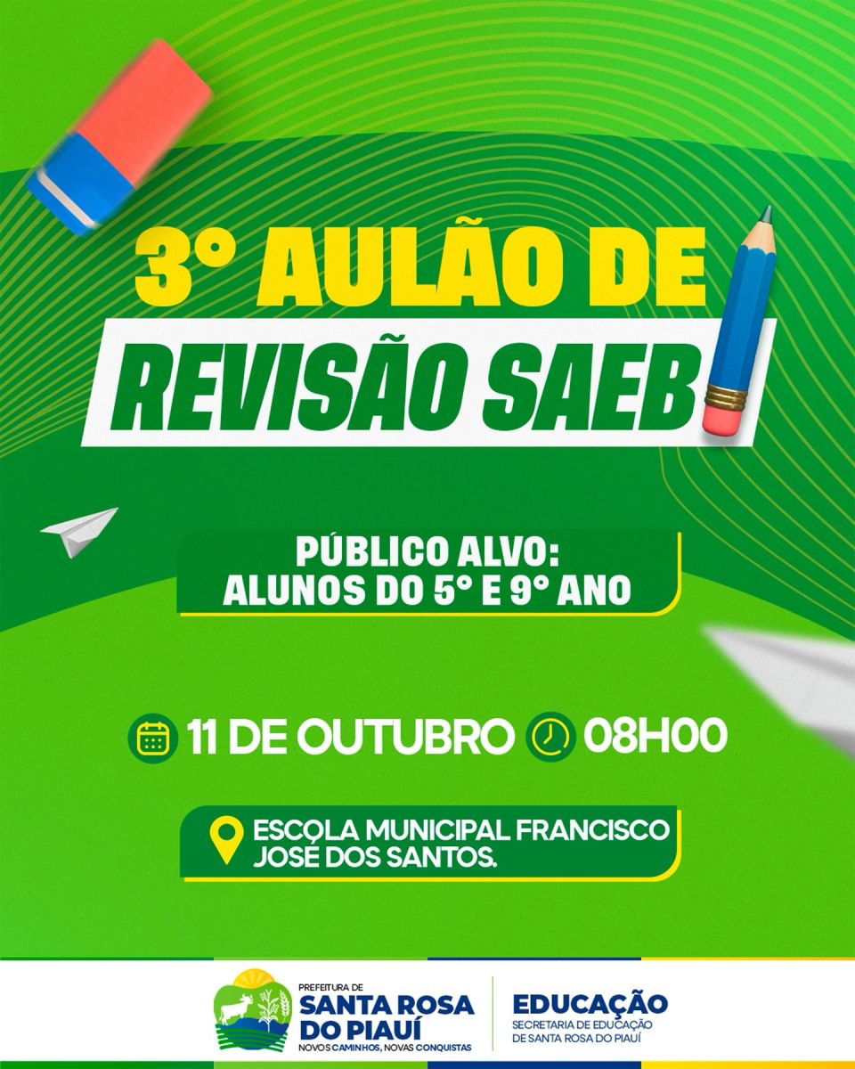 A Prefeitura de Santa Rosa do Piauí, por meio da Secretaria Municipal de Educação, promove o 3º Aulão de Revisão SAEB, destinado aos estudantes do 5º e 9º ano da rede municipal.