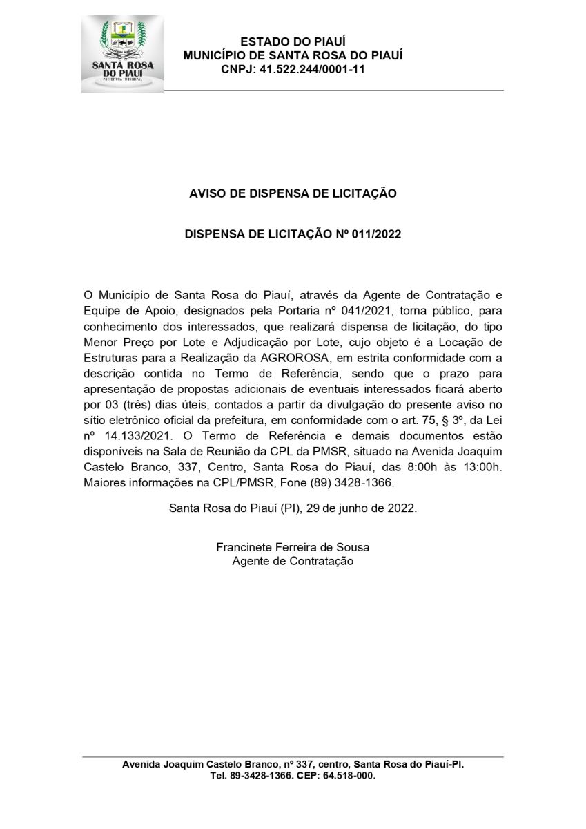 O Município de Santa Rosa do Piauí, através da Agente de Contratação e Equipe de Apoio, designados pela Portaria nº 041/2021, torna público, para conhecimento dos interessados, que realizará dispensa de licitação, do tipo Menor Preço por Lote e Adjudicação por Lote, cujo objeto é a Locação de Estruturas para a Realização da AGROROSA.