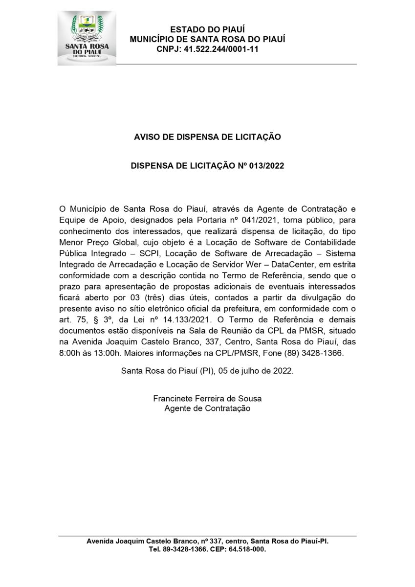 O Município de Santa Rosa do Piauí, através da Agente de Contratação e Equipe de Apoio, designados pela Portaria nº 041/2021, torna público, para conhecimento dos interessados, que realizará dispensa de licitação, do tipo Menor Preço Global, cujo objeto é a Locação de Software de Contabilidade Pública Integrado – SCPI, Locação de Software de Arrecadação – Sistema Integrado de Arrecadação e Locação de Servidor Wer – DataCenter